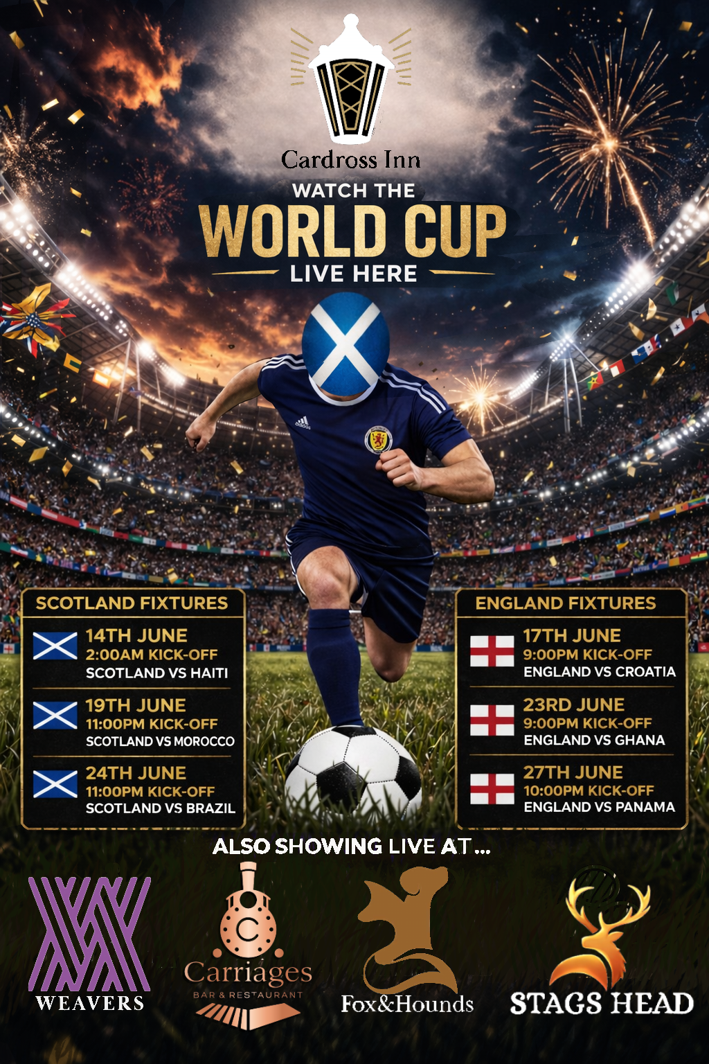Looking for the perfect place to watch the World Cup games with your friends? Come join us at Cardross and be part of the excitement! Grab your mates, grab a drink, and cheer on your team with us!